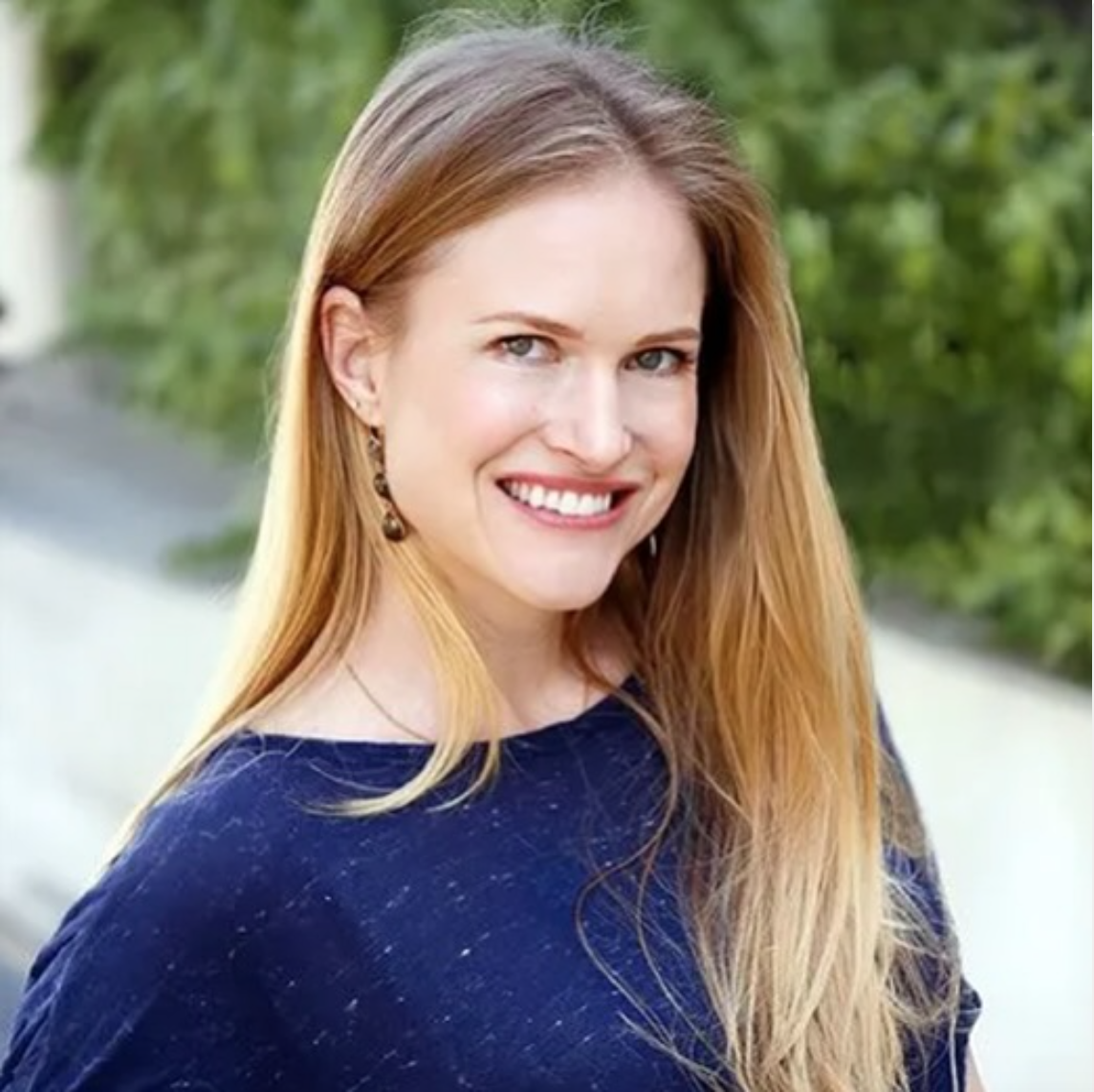 Portrait of a Dr. Christina Tracy Stein with long red hair, wearing a dark blue top and earrings, outdoors with greenery in the background.